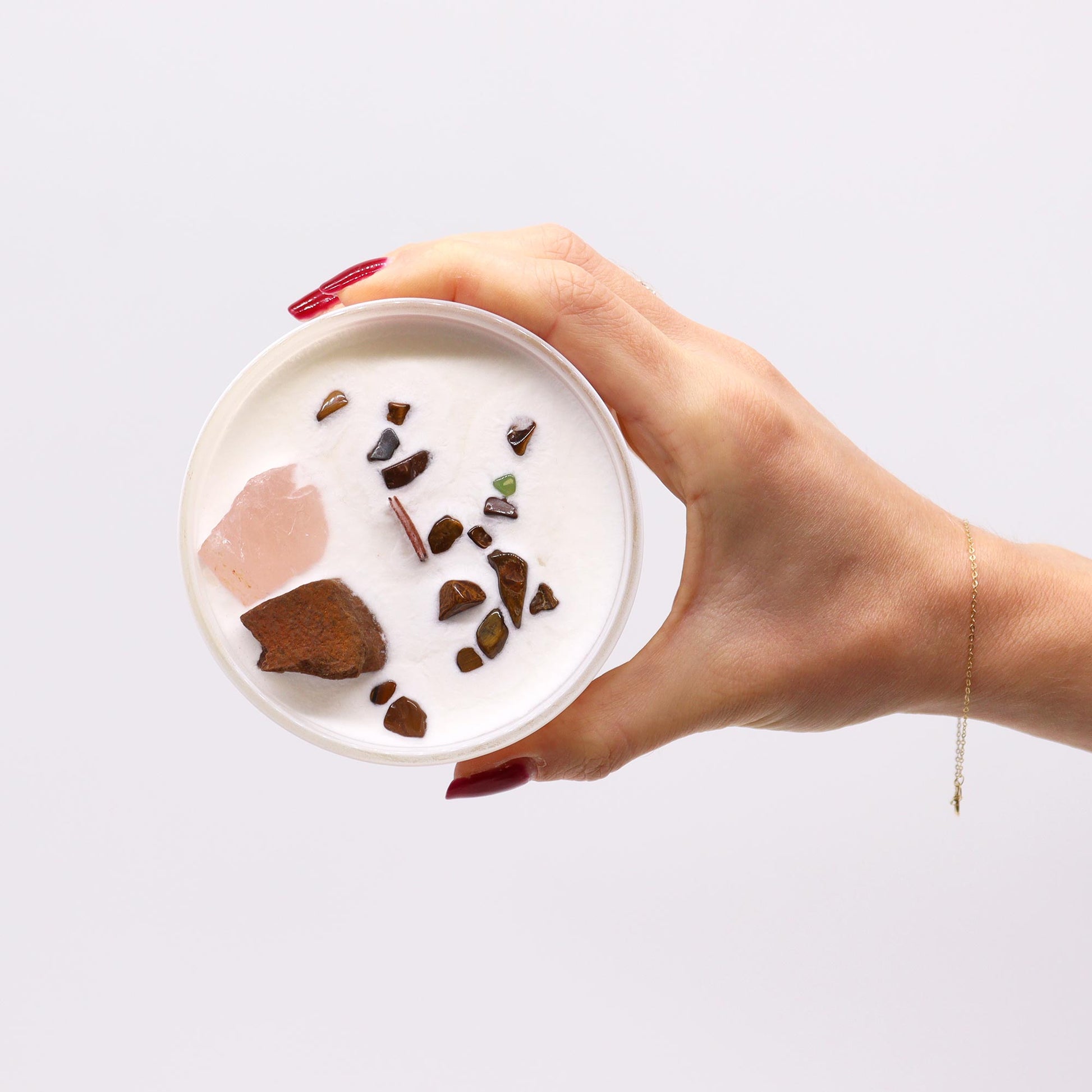- Gemstones: The candle is adorned with the healing power of Tigers Eye and Rose Quartz crystals, known for enhancing creativity and nurturing emotional balance.